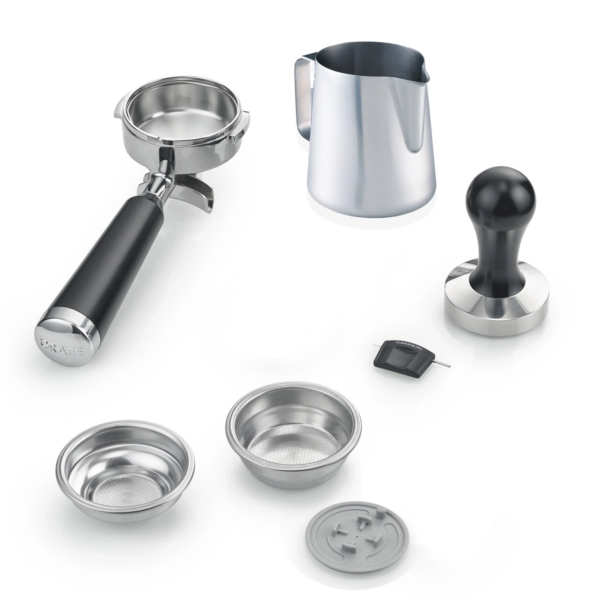 Siebträger mit 2er-Auslauf, einwandige Espressosiebe (1 & 2 Tassen), Tamper, Milchkännchen (600 ml), Reinigungsset (Blindsieb & Reinigungspinsel) sowie Bedienungsanleitung.